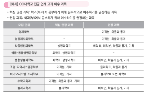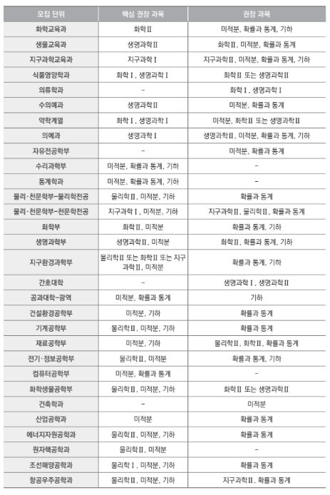 예를 들어, 수리과학부를 희망하는 학생이라면 미적분, 확률과 통계, 기하 과목을 선택하는것이 핵심입니다.
